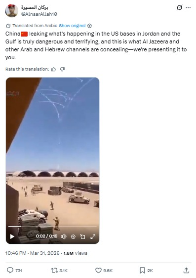 इस वीडियो को शेयर करते हुए एक यूजर ने अरबी भाषा में कैप्शन लिखा, जिसका हिन्दी अनुवाद है, ‘चीन ने जॉर्डन और खाड़ी क्षेत्र में स्थित अमेरिकी ठिकानों पर असल में क्या चल रहा है, उससे जुड़ी जानकारियाँ लीक कर दी हैं—ऐसी जानकारी जो बेहद खतरनाक और खौफनाक है। यह ठीक वही विषय है जिसे अल जज़ीरा—और उसके साथ-साथ अन्य “अरब-हिब्रू” चैनल—जान-बूझकर छिपा रहे हैं; हम इसे यहाँ आपके सामने प्रस्तुत कर रहे हैं।’