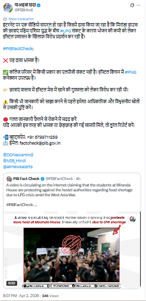 इसके अलावा, Press Information Bureau (PIB) के फैक्ट चेक में स्पष्ट किया गया है कि कॉलेज परिसर में किसी प्रकार का एलपीजी संकट नहीं है। हॉस्टल किचन में PNG कनेक्शन उपलब्ध है। PIB के अनुसार, छात्राएं केवल मेस में मिलने वाले भोजन की गुणवत्ता को लेकर विरोध कर रही थीं।