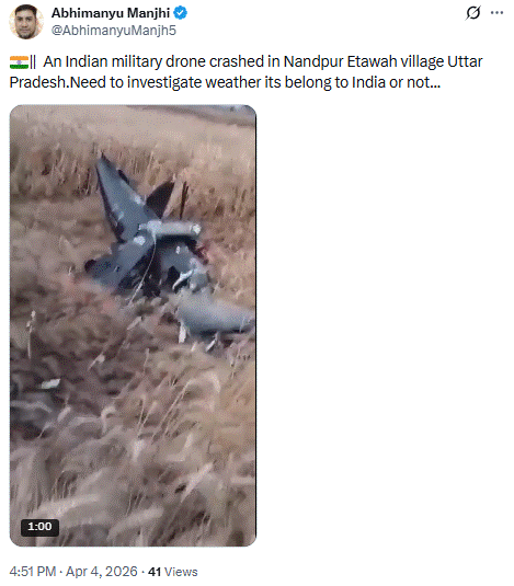 وہیں ایک دیگر ویریفائیڈ یوزر پاکستان اکنامک نیٹ ورک نے وائرل ویڈیو کو شیئر کرتے ہوئے لکھا کہ رپورٹس کے مطابق، اتر پردیش کے اٹاوہ ضلع کے نندپور گاؤں میں ایک ملٹری ڈرون گندم کے کھیت میں کریش ہو گیا۔ ابھی تک کسی کے ہلاک یا زخمی ہونے یا کسی قسم کے نقصان کی کوئی تصدیق نہیں ہوئی ہے، اور کریش کی وجہ بھی ابھی واضح نہیں ہے۔