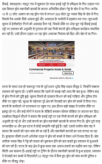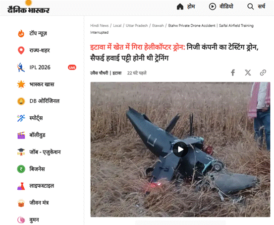اٹاوہ پولیس کے سرکاری بیان کے مطابق، سیفئی علاقے میں ایک نجی کمپنی کا پروٹو ٹائپ ڈرون گاؤں نندپور میں ٹرائل کے دوران گر گیا۔ سیکیورٹی کے پیش نظر ڈرون کے پارٹس کو تحویل میں لے لیا گیا۔ کسی قسم کی جانی نقصان نہیں ہوا اور صورتحال معمول کے مطابق ہے۔