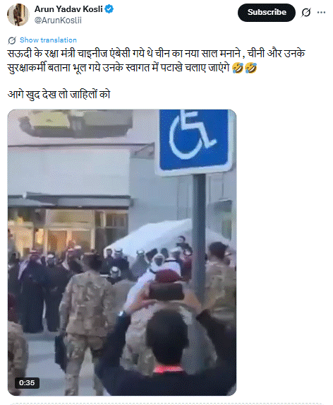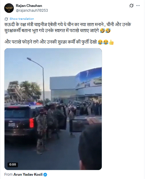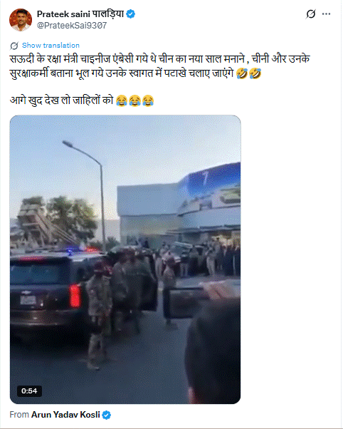 सोशल साईट X पर वेरिफाइड यूजर अरुण यादव कोसली ने वायरल वीडियो को शेयर कर आपत्तिजनक टिप्पणी करते हुए लिखा कि सऊदी के रक्षा मंत्री चाइनीज एंबेसी गये थे चीन का नया साल मनाने, चीनी और उनके सुरक्षाकर्मी बताना भूल गये उनके स्वागत में पटाखे चलाए जाएंगे. आगे खुद देख लो जाहिलों को