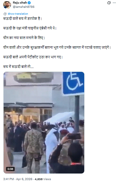 वहीं एक अन्य वेरिफाइड यूजर राजू शाह ने वायरल वीडियो के हवाले से लिखा कि सऊदी वाले सच में डरपोक है | सऊदी के रक्षा मंत्री चाइनीज एंबेसी गये थे | चीन का नया साल मनाने के लिए | चीन वालों और उनके सुरक्षाकर्मी बताना भूल गये उनके स्वागत में पटाखे चलाए जाएंगे | सऊदी बाले अपनी पेटीकोट उठा कर भाग गए | सच में सऊदी बाले तो.…