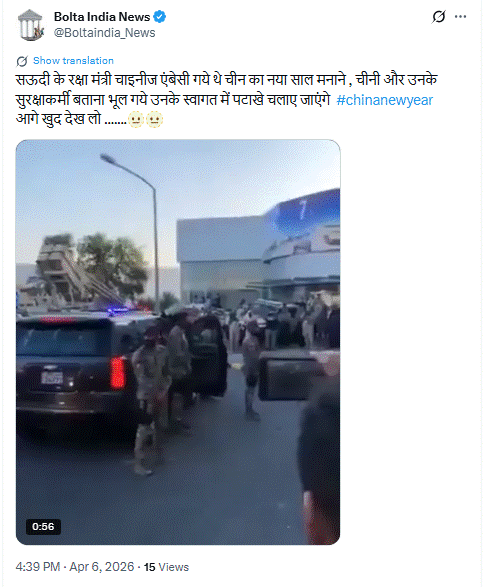 सोशल मीडिया प्लेटफॉर्म X (formerly Twitter) पर एक वीडियो तेजी से वायरल हो रहा है। इस वीडियो को लेकर दावा किया जा रहा है कि सऊदी अरब के रक्षा मंत्री चीन के नए साल के अवसर पर चीनी दूतावास पहुंचे थे, जहां स्वागत में पटाखे चलाए गए। दावा है कि पटाखों की आवाज सुनकर वह घबरा गए और वहां से भाग खड़े हुए।