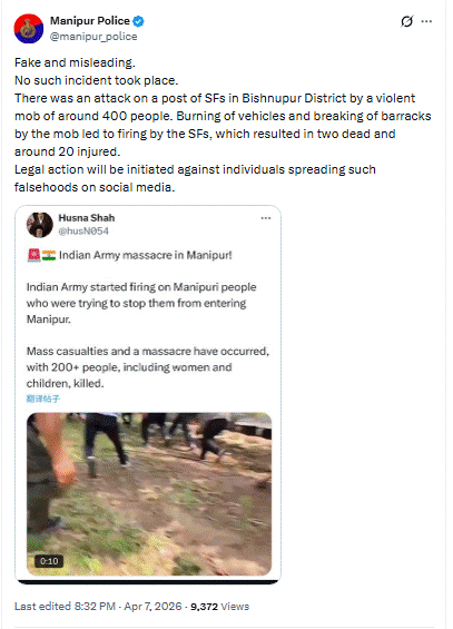 महत्वपूर्ण रूप से, Manipur Police ने भी वायरल वीडियो के साथ किए जा रहे दावों का खंडन किया है। पुलिस के अनुसार, बिष्णुपुर ज़िले में सुरक्षा बलों की एक चौकी पर लगभग 400 लोगों की हिंसक भीड़ ने हमला किया था। इस दौरान भीड़ द्वारा वाहनों में आगजनी और बैरकों में तोड़फोड़ की गई, जिसके बाद हालात को नियंत्रित करने के लिए सुरक्षा बलों को गोली चलानी पड़ी। इस कार्रवाई में दो लोगों की मृत्यु हुई, जबकि लगभग 20 लोग घायल हो गए। पुलिस ने स्पष्ट किया है कि सोशल मीडिया पर फैलाया जा रहा “नरसंहार” का दावा झूठा और भ्रामक है। साथ ही, ऐसी अफवाहें फैलाने वालों के विरुद्ध विधि अनुसार सख्त कार्रवाई किए जाने की चेतावनी भी दी गई है।