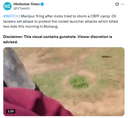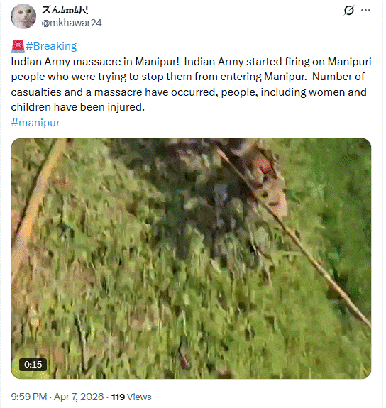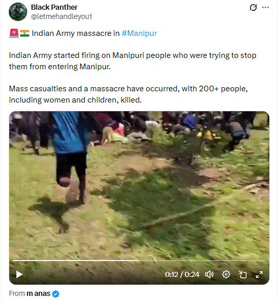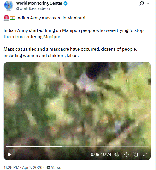 सोशल साइट X (पूर्व ट्विटर) पर वेरिफाइड यूजर वर्ल्ड मॉनिटरिंग सेंटर ने वायरल वीडियो को शेयर कर लिखा कि मणिपुर में इंडियन आर्मी का नरसंहार! इंडियन आर्मी ने मणिपुरी लोगों पर फायरिंग शुरू कर दी, जो उन्हें मणिपुर में घुसने से रोकने की कोशिश कर रहे थे। बड़े पैमाने पर मौतें और नरसंहार हुआ है, जिसमें महिलाओं और बच्चों समेत दर्जनों लोग मारे गए हैं।
