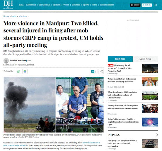 इसके साथ ही हमें घटना से संबंधित Deccan Herald, The Indian Exspress, और NDTV India की एक रिपोर्ट भी प्राप्त हुई। इस रिपोर्ट के अनुसार, मंगलवार को मणिपुर के घाटी क्षेत्रों में उस समय पुनः अशांति फैल गई, जब एक बीएसएफ जवान के घर पर हुए बम हमले में सोते समय उसके दो बच्चों की मृत्यु हो गई। इस घटना के बाद व्यापक विरोध प्रदर्शन शुरू हो गए, जो बाद में हिंसक रूप ले बैठे। इन झड़पों के दौरान दो अन्य लोगों की भी मौत हो गई, जबकि पाँच लोग घायल हुए।