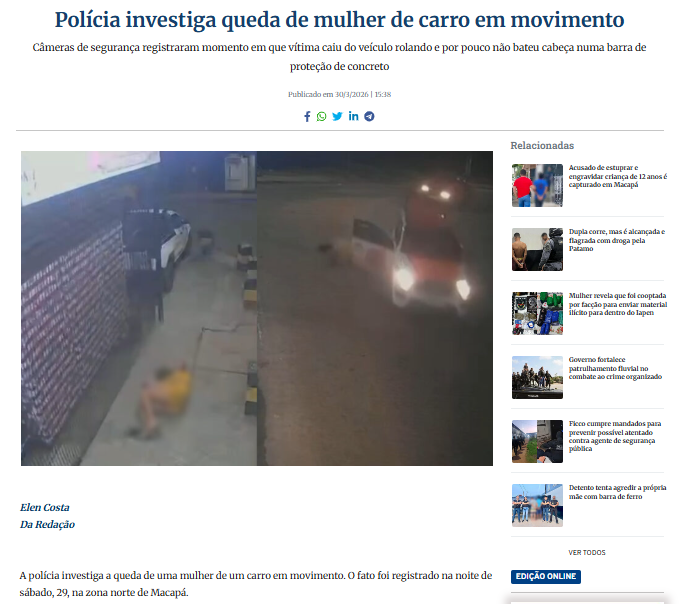 DFRAC की टीम ने वायरल वीडियो की जांच में पाया कि यह फरीदाबाद की घटना का वीडियो नहीं है और इस घटना में रेप का मामला भी नहीं है। यह वीडियो ब्राजील का है, जहां पति-पत्नी के बीच विवाद के बाद यह घटना हुई थी। हमें इस वीडियो के संदर्भ में ब्राजील की कई मीडिया रिपोर्ट्स मिलीं। Diário do Amapá की रिपोर्ट के मुताबिक, ‘पुलिस चलती कार से एक महिला के गिरने की घटना की जांच कर रही है। यह घटना 29 मार्च की रात को उत्तरी मकापा में हुई। कार में दंपति के अलावा दो अन्य लोग भी थे, जिसमें पीड़िता का भाई और उसकी भाभी थी। उन सभी ने घटनाक्रम की पुष्टि करते हुए बताया कि दंपति के बीच कहासुनी के बाद, महिला ने कहा कि वह कूद जाएगी और पुरुष ने कहा कि वह भी कूद सकता है।’ (हिन्दी अनुवाद)