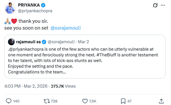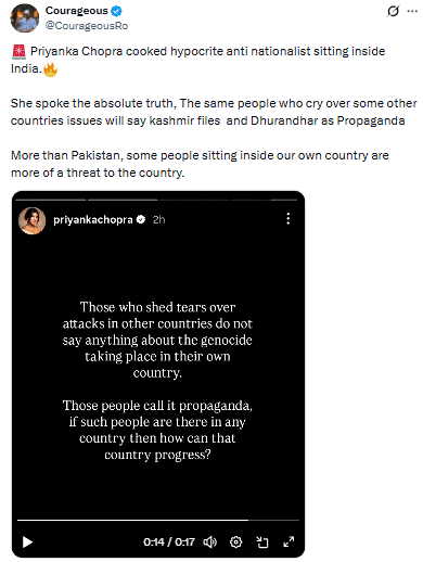 सोशल साइट X पर वेरिफाइड यूजर Courageous ने प्रियंका चोपड़ा की कथित इंस्टाग्राम स्टोरी के स्क्रीनग्रैब की वीडियो क्लिप शेयर कर लिखा कि प्रियंका चोपड़ा ने भारत में बैठे पाखंडी और देश-विरोधी लोगों को करारा जवाब दिया। उन्होंने बिल्कुल सच कहा; वही लोग जो दूसरे देशों के मुद्दों पर हाय-तौबा मचाते हैं, वे ही ‘द कश्मीर फाइल्स’ और ‘धुरंधर’ जैसी फिल्मों को ‘प्रोपगैंडा’ (दुष्प्रचार) करार देंगे। पाकिस्तान से कहीं ज़्यादा, हमारे अपने ही देश में बैठे कुछ लोग देश के लिए बड़ा खतरा हैं।