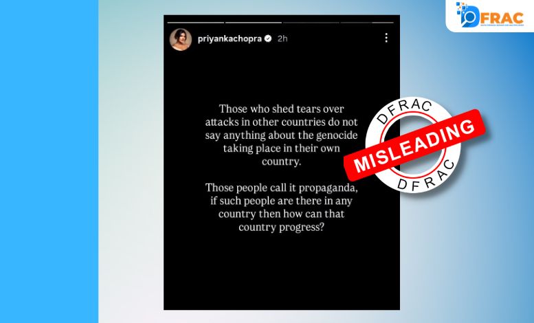 सोशल मीडिया पर प्रियंका चोपड़ा के नाम से वायरल हो रहा बयान भ्रामक (Misleading) है। इस दावे के समर्थन में कोई ठोस या आधिकारिक प्रमाण उपलब्ध नहीं है, और न ही उनके आधिकारिक अकाउंट्स पर ऐसा कोई बयान पाया गया।