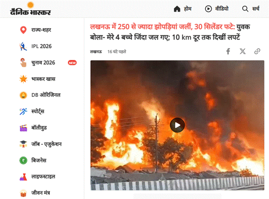 वायरल दावे की जांच के लिए DFRAC ने वीडियो के कीफ्रेम निकालकर रिवर्स इमेज सर्च किया। जांच के दौरान यही वीडियो हमें दैनिक भास्कर की एक रिपोर्ट में मिला। रिपोर्ट के अनुसार, यह घटना लखनऊ के विकासनगर इलाके की है, जहां बुधवार शाम करीब 5:30 बजे भीषण आग लग गई थी।