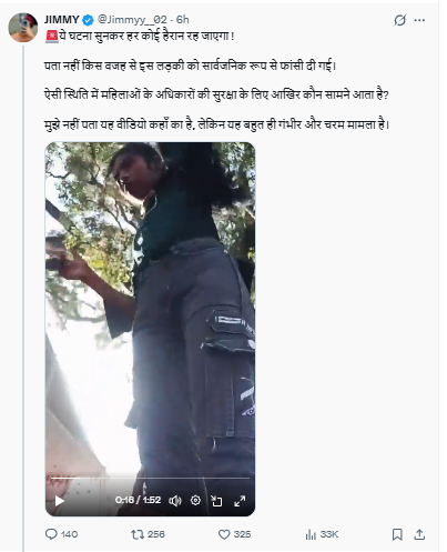 एक यूजर ने वीडियो शेयर कर लिखा, ‘ये घटना सुनकर हर कोई हैरान रह जाएगा ! पता नहीं किस वजह से इस लड़की को सार्वजनिक रूप से फांसी दी गई। ऐसी स्थिति में महिलाओं के अधिकारों की सुरक्षा के लिए आखिर कौन सामने आता है? मुझे नहीं पता यह वीडियो कहाँ का है, लेकिन यह बहुत ही गंभीर और चरम मामला है।’