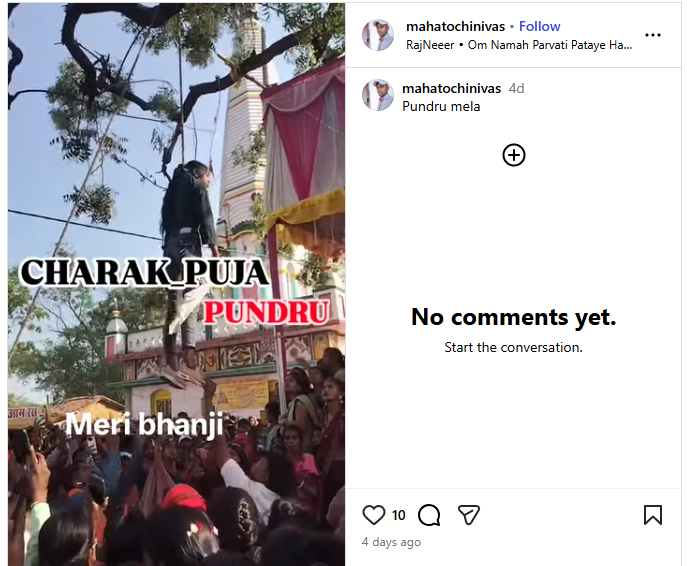 इसके बाद वीडियो के कीफ्रेम्स को रिवर्स इमेज सर्च करने पर हमें यह वीडियो एक इंस्टाग्राम यूजर mahatochinivas द्वारा पोस्ट मिला। इस पोस्ट में उसने युवती को अपनी भांजी बताया है, साथ ही यह जानकारी भी दी है कि यह वीडियो पुंडरू मेला का है।