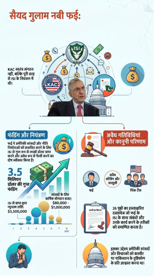 गुलाम नबी फाई का नाम लंबे समय से कश्मीर मुद्दे पर अंतरराष्ट्रीय स्तर पर सक्रिय लॉबिंग से जुड़ा रहा है। वे विशेष रूप से अमेरिकी नीति-निर्माताओं, थिंक टैंक्स और अंतरराष्ट्रीय मंचों पर कश्मीर से संबंधित विमर्श को प्रभावित करने की कोशिशों के लिए जाने जाते रहे हैं। हालांकि, उनकी गतिविधियों को लेकर समय-समय पर गंभीर सवाल भी उठते रहे हैं, खासकर जांच एजेंसियों और विश्वसनीय मीडिया रिपोर्ट्स के आधार पर।