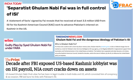 कानूनी दस्तावेजों और बाद की जांचों से यह भी सामने आया कि फाई ने अंतरराष्ट्रीय मंचों, कॉन्फ्रेंसों और अभियानों का इस्तेमाल कश्मीर पर एकतरफा और प्रायोजित नैरेटिव को आगे बढ़ाने के लिए किया। इंडिया टुडे की 9 दिसंबर 2011 की रिपोर्ट के मुताबिक नए कोर्टी दस्तावेजों से पता चलता है कि अलगाववादी सैयद गुलाम नबी फाई और उनकी कश्मीरी अमेरिकन काउंसिल (केएसी) पूरी तरह से आई एसआई के नियंत्रण में थी, और पाकिस्तान की जासूसी एजेंसी के विस्तार के रूप में काम कर रहे थे ताकि अमेरिकी सांसदों, अधिकारियों और विचारों को कश्मीर पर अपने दृष्टिकोण के बारे में आश्वस्त किया जा सके। फाई को आई एसआई के लिए जासूसी करने, कश्मीर पर अमेरिकी नीति को प्रभावित करने और आई एसआई से गुप्त रूप से धन प्राप्त करने के संघीय आरोपों में दोषी ठहराया गया।