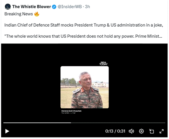 सोशल साइट X पर वेरिफाइड यूजर “द व्हिसल ब्लोवर” ने वीडियो शेयर करते हुए दावा किया कि इंडियन चीफ ऑफ डिफेंस स्टाफ ने मज़ाक में कहा कि अमेरिकी राष्ट्रपति के पास कोई वास्तविक शक्ति नहीं है और इजरायली प्रधानमंत्री नेतन्याहू ही अमेरिका के वास्तविक शासक हैं।