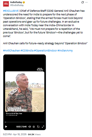 वीडियो के कैप्शन में बताया गया था कि चीफ ऑफ डिफेंस स्टाफ जनरल अनिल चौहान ने भारत को “ऑपरेशन सिंदूर” के अगले चरण के लिए तैयार रहने की जरूरत पर जोर दिया। उन्होंने कहा कि सशस्त्र बलों को पुराने ऑपरेशन्स से आगे बढ़कर भविष्य की चुनौतियों के लिए तैयार रहना चाहिए।