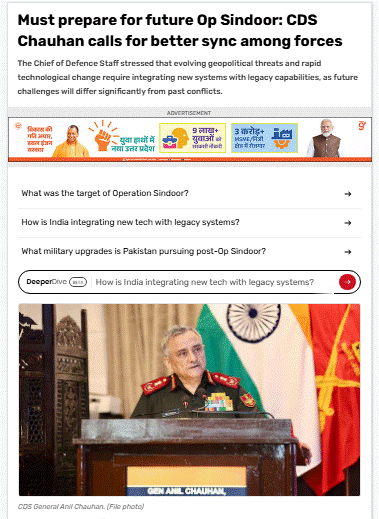 उत्तराखंड में भारत-चीन सीमा के पास India Today को दिए इंटरव्यू में जनरल अनिल चौहान ने कहा था कि भारत को पिछले “ऑपरेशन सिंदूर” की पुनरावृत्ति के लिए नहीं, बल्कि भविष्य की चुनौतियों के लिए तैयार रहना चाहिए। उन्होंने सेना की भविष्य की रणनीति, नई सैन्य चुनौतियों और तैयारियों पर बात की थी।