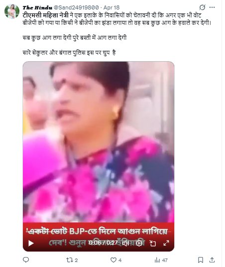 सोशल मीडिया पर एक महिला का वीडियो इस दावे के साथ शेयर किया जा रहा है कि पश्चिम बंगाल में टीएमसी की महिला नेत्री ने स्थानीय निवासियों को बीजेपी को वोट देने या फिर बीजेपी का झंडा लगाने पर आग लगाने की धमकी दी है।