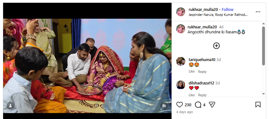 इसके अलावा rukhsar_mulla20 ने दूल्हा और दुल्हन की शादी की रस्मों के साथ वाली अन्य वीडियो भी शेयर किया है। एक वीडियो को उन्होंने दूल्हा-दुल्हन की अंगूठी ढूंढने की रस्म बताते हुए शेयर किया है, जिसमें स्पष्ट तौर पर दुल्हन को देखा जा सकता है।