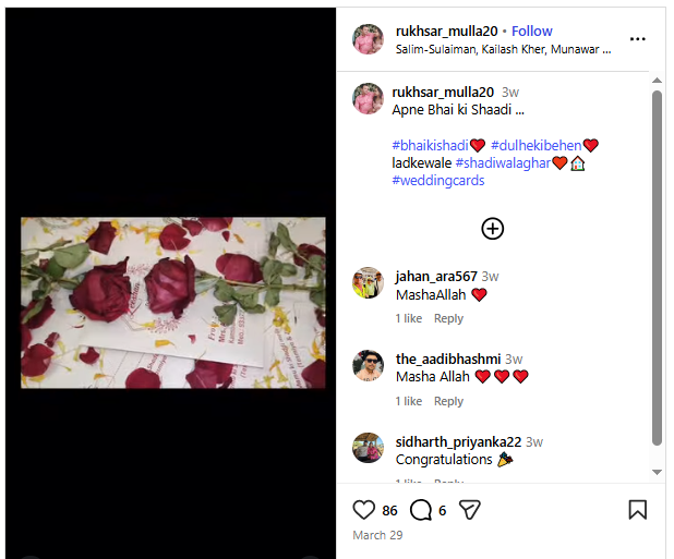 वहीं, रूख्सार मुल्ला ने एक और वीडियो शेयर किया है, जिसमें शादी का कार्ड देखा जा सकता है। उन्होंने अपने भाई की शादी बताकर इस वीडियो को शेयर किया है। शादी के कार्ड पर पता राउरकेला-ओडिशा लिखा है। कार्ड पर दूल्हे का नाम जीशान और दुल्हन का नाम अनम लिखा हुआ है।
