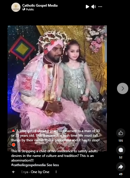 Catholic Gospel Media नामक यूजर ने वीडियो शेयर कर अंग्रेजी भाषा में कैप्शन लिखा, जिसका हिन्दी अनुवाद है, ‘लगभग 9 साल की एक छोटी बच्ची की शादी 30 या 35 साल के एक आदमी से कर दी गई। यह तो पागलपन है! अब समय आ गया है कि हम चीज़ों को उनके सही नाम से पुकारें: यह ‘पेडोफ़िलिया’ (बाल यौन शोषण) है और इसे हर हाल में रुकना ही चाहिए!