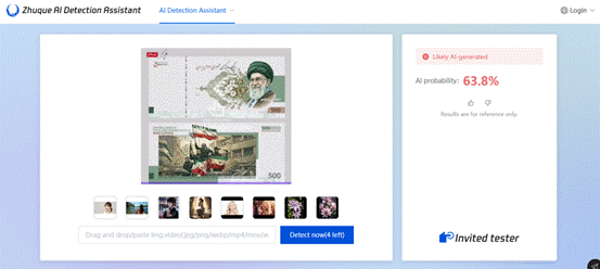 वायरल तस्वीर की तकनीकी जांच भी की गई। AI डिटेक्शन टूल Zhuque AI Detection Assistant के अनुसार इस इमेज के AI-जनित होने की संभावना लगभग 63.8 प्रतिशत है।