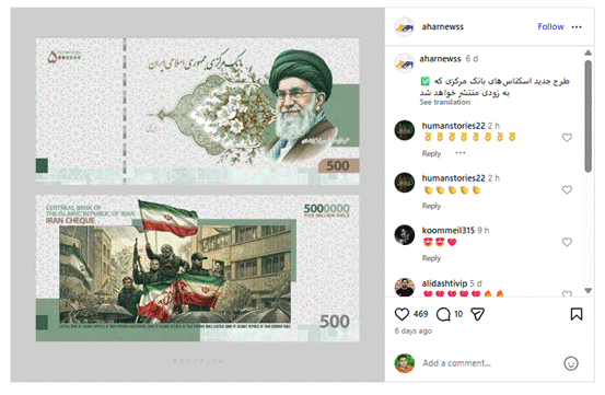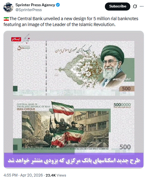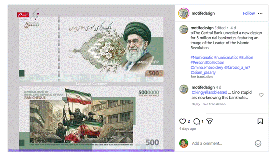 सोशल साईट X पर वेरिफाइड यूजर स्प्रिंटर प्रेस एजेंसी ने वायरल तस्वीर को शेयर कर लिखा कि केंद्रीय बैंक ने 50 लाख रियाल के बैंकनोटों का एक नया डिज़ाइन जारी किया है, जिसमें इस्लामी क्रांति के नेता की तस्वीर अंकित है।