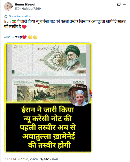 वहीं एक अन्य यूजर हुमा मीर ने वायरल तस्वीर को शेयर कर लिखा कि Iran ने जारी किया न्यू करेंसी नोट की पहली तस्वीर जिस पर अयातुल्ला ख़ामेनेई साहब की तस्वीर है माशाअल्लाह
