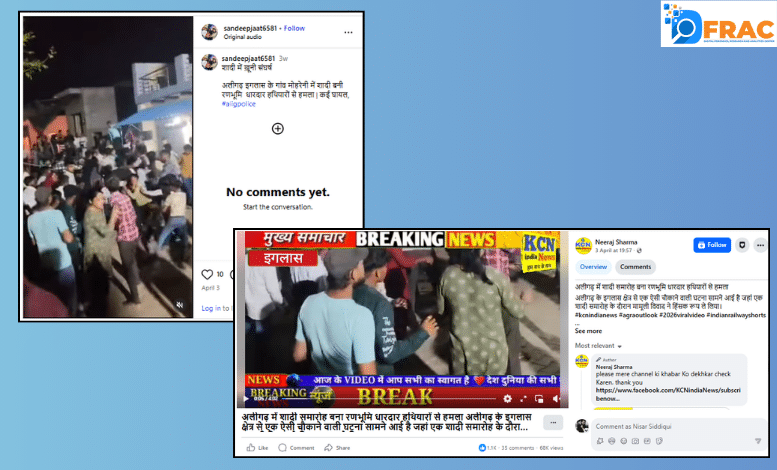 DFRAC की टीम ने जांच में पाया कि वायरल वीडियो के साथ किया जा रहा दावा भ्रामक है। वायरल वीडियो अलीगढ़ के इगलास इलाके के मोहरेनी गांव में शादी समारोह के दौरान मारपीट का है। हमें यह वीडियो कई सोशल मीडिया हैंडल्स पर 3 अप्रैल को पोस्ट मिला। ऋषि चौधरी नामक अलीगढ़ के एक स्थानीय पत्रकार ने वीडियो पोस्ट कर जानकारी दी है, ‘शादी में ख़ूनी संघर्ष. अलीगढ़ इगलास के गांव मोहरेनी में शादी बनी रणभूमि धारदार हथियारों से हमला | कई घायल, #aligpolice‘