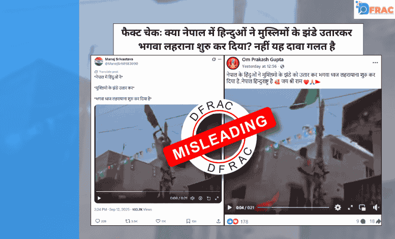 सोशल मीडिया पर एक वीडियो नेपाल का बताकर शेयर किया जा रहा है। इस वीडियो में देखा जा सकता है कि एक युवक हरा झंडा उतारकर भगवा झंडा लगा देता है। इस वीडियो के साथ किया जा रहा है कि नेपाल में हिन्दुओं द्वारा मुस्लिमों का झंडा उतारकर भगवा लहराया जा रहा है। मनोज श्रीवास्तव […]