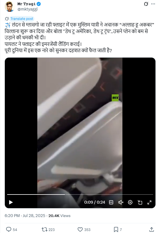 مسٹر تیاگی نامی یوزر نے اس ویڈیو کو شیئر کرتے ہوئے لکھا: "لندن سے گلاسگو جانے والی پرواز میں ایک مسلم مسافر نے اچانک ‘اللہ اکبر’ کا نعرہ لگانا شروع کر دیا اور کہا ‘ڈیتھ ٹو امریکہ، ڈیتھ ٹو ٹرمپ’… اس نے جہاز کو بم سے اُڑانے کی دھمکی بھی دی۔ پائلٹ نے فلائٹ کی ایمرجنسی لینڈنگ کرائی۔ پوری دنیا میں اس ایک نعرے کو سن کر دہشت کیوں پھیل جاتی ہے؟”