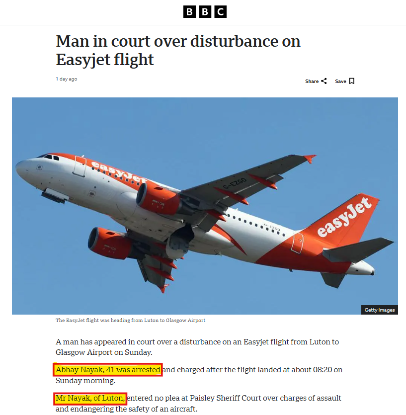DFRAC کی ٹیم نے گوگل پر کچھ کی ورڈز تلاش کیے۔ ہمیں اس واقعے کے بارے میں قومی اور بین الاقوامی میڈیا کی کئی خبریں ملیں۔ ان رپورٹس میں ملزم کا نام ابھے نائک بتایا گیا ہے۔ بی بی سی کی رپورٹ میں بتایا گیا ہے کہ لیوٹن سے گلاسگو جانے والی ایزی جیٹ کی پرواز میں خلل کے معاملے میں ابھے نائک کو گرفتار کر پیسلے شیرف کورٹ میں پیش کیا گیا۔