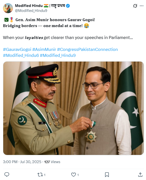 اس تصویر کو شیئر کرتے ہوئے ایک یوزر نے لکھا: "جنرل عاصم منیر نے گورو گوگوئی کو اعزاز سے نوازا! سرحدوں کو مٹانا — ایک وقت میں ایک تمغہ! جب آپ کی وفاداری پارلیمنٹ میں دی گئی آپ کی تقاریر سے بھی زیادہ واضح ہو جائے…”