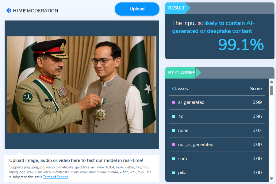 DFRAC کی ٹیم نے وائرل تصویر کی جانچ کی تو معلوم ہوا کہ یہ تصویر اصلی نہیں ہے، بلکہ اسے AI کی مدد سے بنائی گئی ہے ۔ ہماری ٹیم نے AI- ڈیٹیکٹر ٹول Hive Moderation پر اس تصویر کو چیک کیا۔ جانچ کے نتائج سے پتہ چلا کہ اس تصویر کے AI سے تیار ہونے کے امکانات 99.1 فیصد ہیں۔