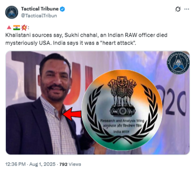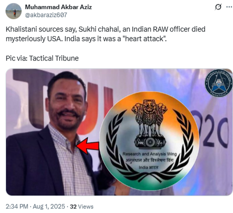 سوشل میڈیا ایکس پر پاکستانی یوزر نے دعویٰ کیا کہ "خالصتانی ذرائع کا کہنا ہے کہ سُکھی چهل، جو کہ ہندوستانی RAW کا افسر تھا، جن کا امریکہ میں پراسرار طور پر انتقال ہو گیا ہے۔ ہندوستان کا کہنا ہے کہ یہ ’ہارٹ اٹیک‘ تھا۔”