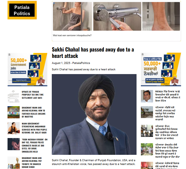 جب ہم نے انٹرنیٹ پر اس دعوے سے متعلق معلومات تلاش کیں تو ہمیں ‘پٹیالہ پولیٹکس’ کی ایک خبر ملی جو 1 اگست 2025 کو شائع ہوئی۔ رپورٹ میں بتایا گیا تھا کہ "سُکھی چهل، پنجاب فاؤنڈیشن USA کے بانی اور خالصتان مخالف آواز، دل کا دورہ پڑنے سے انتقال کر گئے۔” اس مضمون میں کہیں بھی انہیں ہندوستانی ‘RAW’ کا افسر قرار نہیں دیا گیا۔