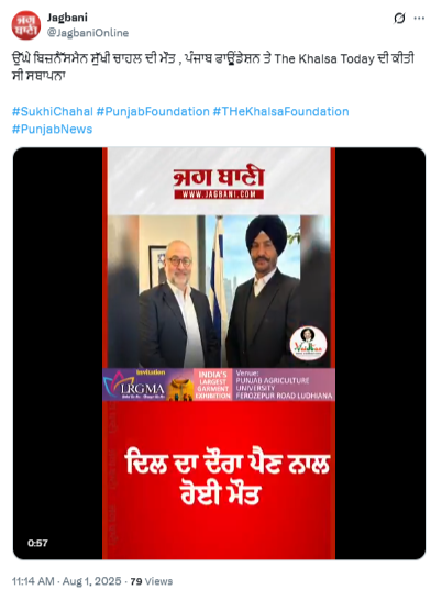 ہمیں ‘جگبانی آن لائن’ کی ایک پوسٹ بھی ملی، جس میں بتایا گیا (اردو ترجمہ): "کاروباری شخصیت سُکھی چهل انتقال کر گئے، انہوں نے پنجاب فاؤنڈیشن اور The Khalsa Today کی بنیاد رکھی تھی۔”
