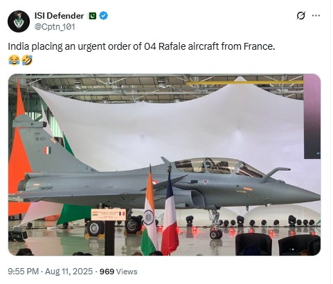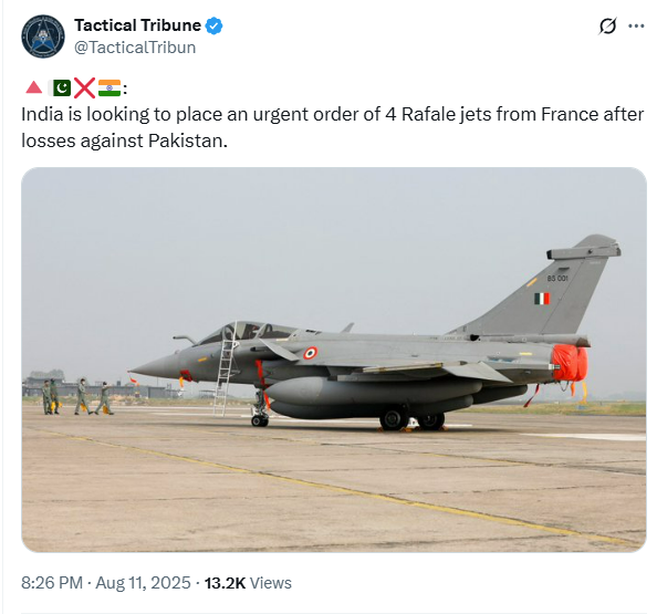 سوشل میڈیا ایکس پر پاکستانی یوزرس نے دعویٰ کیا کہ ، "پاکستان کے خلاف نقصان کے بعد ہنستان نے فرانس سے 4 رافیل جیٹ کا ہنگامی آرڈر دینے جا رہا ہے۔”