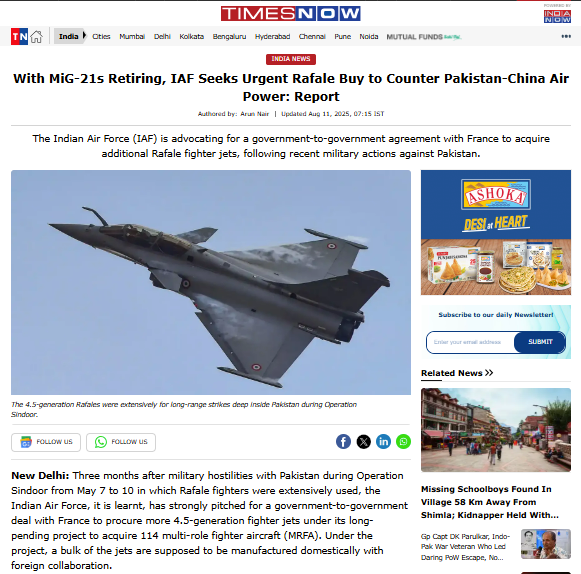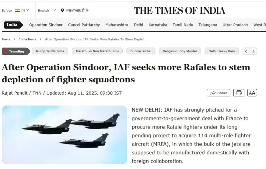 اسی طرح ’ٹائمز ناؤ‘ کی 11 اگست 2025 کی رپورٹ میں بھی یہی بتایا گیا ہے کہ ہندوستانی فضائیہ 4.5 جنریشن کے مزید لڑاکا طیارے فرانس سے لینے کے لیے حکومت سے حکومت کے معاہدے پر زور دے رہی ہے، اور یہ سب MRFA منصوبے کا حصہ ہے۔