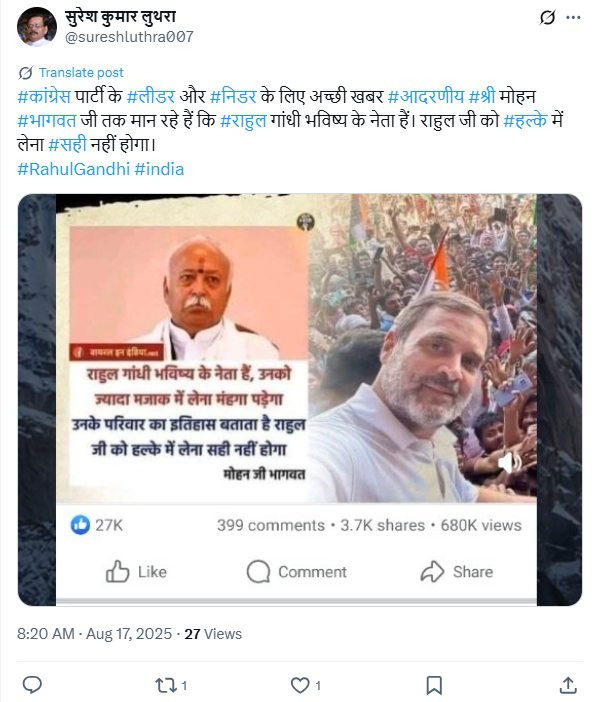 اس انفوگرافک کو شیئر کرتے ہوئے ایک یوزر نے لکھا: ‘#کانگریس پارٹی کے #لیڈر اور #نڈر کے لیے اچھی خبر، #قابلِ احترام #شری موہن #بھاگوت جی تک مان رہے ہیں کہ #راہل گاندھی مستقبل کے لیڈر ہیں۔ راہل جی کو #ہلکے میں لینا #صحیح نہیں ہوگا۔’