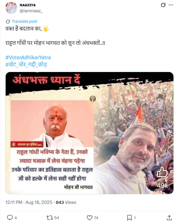 اس کے علاوہ ایک اور یوزر نے بھی انفوگرافک شیئر کرتے ہوئے لکھا: ‘وقت ہے تبدیلی کا، راہل گاندھی پر موہن بھاگوت کو سن لو اندھ بھکتو..!!’