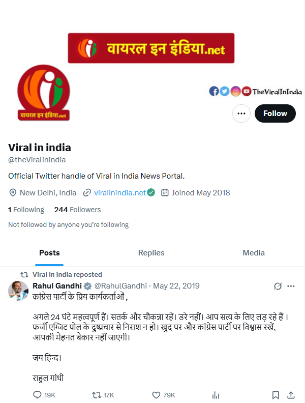 مزید تفتیش کے دوران ہماری ٹیم نے بھاگوت کے بیان والے انفوگرافک کو غور سے دیکھا تو اس پر ViralinIndia.net کا لوگو لگا ہوا تھا۔ اس کے بعد جب ٹیم نے ViralinIndia.net کے ایکس ہینڈل کو دیکھا تو پایا کہ وہاں 2019 سے کوئی پوسٹ نہیں کی گئی ہے۔