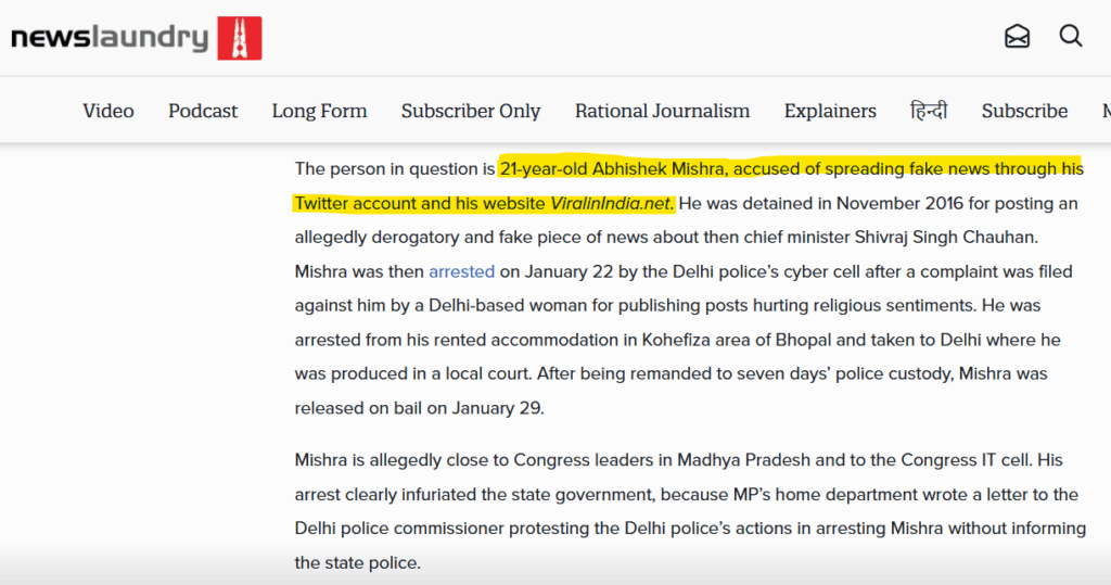 اسی دوران نیوز لانڈری کی ایک رپورٹ ملی، جس کے مطابق ابھشیک مشرا نامی شخص کو اپنے ٹوئٹر اکاؤنٹ اور اپنی ویب سائٹ ViralinIndia.net کے ذریعے فیک نیوز پھیلانے کے الزام میں نومبر 2016 میں حراست میں لیا گیا تھا۔