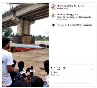 ایک انسٹاگرام یوزر "chhotuchaudhary_3.k” نے ویڈیو شیئر کر لکھا: Patna me train Ganga me hai