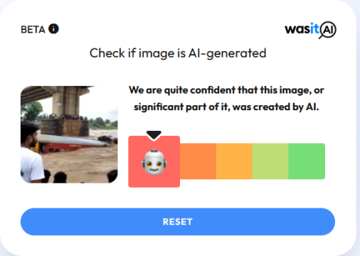 DFRAC ٹیم نے وائرل ویڈیو کی جانچ کی۔ جانچ کے دوران ہمیں اس واقعے کے بارے میں کوئی میڈیا رپورٹس نہیں ملیں اور نہ ہی ہندوستانی ریلوے نے ایسی کسی واقعے کی اطلاع دی ہے۔ اس کے بعد ویڈیو کو ہم نے AI ڈیٹیکشن ٹول WasitAi سے چیک کیا، تو معلوم ہوا کہ یہ ویڈیو AI کے ذریعے بنایا گیا ہے۔