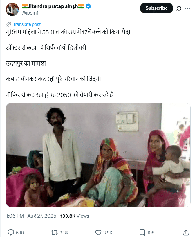 جیتندر پرتاپ سنگھ نامی یوزر نے لکھا: "مسلم خاتون نے 55 سال کی عمر میں 17واں بچہ پیدا کیا۔ ڈاکٹر سے کہا – یہ صرف چوتھی ڈلیوری ہے۔ ادے پور کا معاملہ، کباڑ چن کر کٹ رہی ہے پورے خاندان کی زندگی۔ میں پھر سے کہہ رہا ہوں وہ 2050 کی تیاری کر رہے ہیں۔”