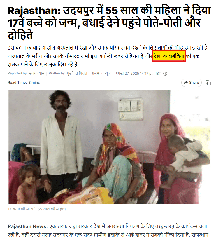 این ڈی ٹی وی راجستھان کی رپورٹ میں لکھا گیا ہے: "راجستھان کے آدیواسی علاقے میں شامل جھاڑول خطے کے لیلاواس گاؤں کی رہنے والی ریکھا کالبیلیا نے جھاڑول کے کمیونٹی ہیلتھ سینٹر میں اپنے 17ویں بچے کو جنم دیا ہے۔”