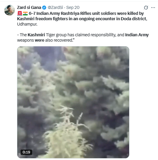 سوشل میڈیا پر کئی پوسٹس گردش کر رہی ہیں، جن میں دعویٰ کیا جا رہا ہے کہ اُدھمپور کے ڈوڈا ضلع میں ایک انکاؤنٹر کے دوران ہندوستانی فوج کی راشٹریہ رائفلز کے 6–7 جوان مارے گئے۔ ان پوسٹس میں الزام لگایا گیا ہے کہ کشمیری عسکریت پسندوں نے یہ حملہ کیا، جس کے نتیجے میں ہندوستانی جانی نقصان ہوا۔ دعوے کی سنگینی کو دیکھتے ہوئے ہم نے اسے سرکاری ذرائع سے جانچنے کی کوشش کی۔