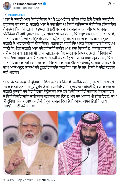 ایک ایکس یوزر نے دعویٰ کرتے ہوئے لکھا "ہندوستان نے سعودی عرب سے تعلق رکھنے والے پیٹرولیم سے بھرے 300 ٹینکر واپس کردیے جس سے سعودی عرب میں ہلچل مچ گئی۔ کیا سعودی عرب نے سوچا تھا کہ پاکستان کے ساتھ دفاعی معاہدہ کر کے اسے سعودی عرب پر حملہ تصور کیا جائے گا اور بھارت جوابی کارروائی نہیں کرے گا؟ کیا بھارت خاموش رہے گا؟ لیکن سعودی شہزادہ یہ بھول گئے کہ یہ نیا ہندوستان ہے، مودی سرکار جو قومی مفادات پر سمجھوتہ نہیں کرتی۔ بھارتی حکومت نے فوری طور پر سعودی عرب سے آنے والے ٹینکروں کو روک دیا۔ بتایا جاتا ہے کہ ہندوستان کے اس اقدام کے 24 گھنٹوں کے اندر سعودی عرب کی معیشت میں تقریباً 10 فیصد کمی واقع ہوئی ہے۔ مزید برآں، ہندوستان نے یہ انتباہ بھی کیا کہ سعودی عرب کو برآمدات بھی روک دی جائیں گی، جو خوراک کے لیے ہندوستان پر انحصار کرتا ہے۔ جس سے سعودی عرب میں ہلچل مچ گئی۔ سعودی شہزادے نے خود مودی سرکار کو فون کرکے پاکستان کے ساتھ معاہدے کی وضاحت کی۔ بھارت کے ساتھ بھارت کے غیر متزلزل تعلقات کا حوالہ دیتے ہوئے انہوں نے کہا کہ بھارت کے ساتھ تعلقات برقرار رہیں گے۔ بھارت کے اس اقدام نے دنیا کو ہلا کر رکھ دیا ہے۔ کیونکہ یورپ جیسی سپر پاور بھی سعودی عرب کے خلاف ایسے سخت قدم اٹھانے سے پہلے ہزار بار سوچتی ہے کیونکہ اول تو سعودی عرب مسلمانوں کا مرکز ہے اور دوسرا پٹرول کا گڑھ ہے۔ لیکن مودی سرکار کے اس قدم نے جیو سیاست کی مساواتیں بدل کر رکھ دی ہیں اور نئی جہتیں بھی کھول دی ہیں، اس کے ساتھ ہی دنیا پر واضح الفاظ میں واضح کر دیا ہے کہ بھارت اپنے مفادات سے کوئی سمجھوتہ نہیں کرے گا….!!!” (اردو ترجمہ)