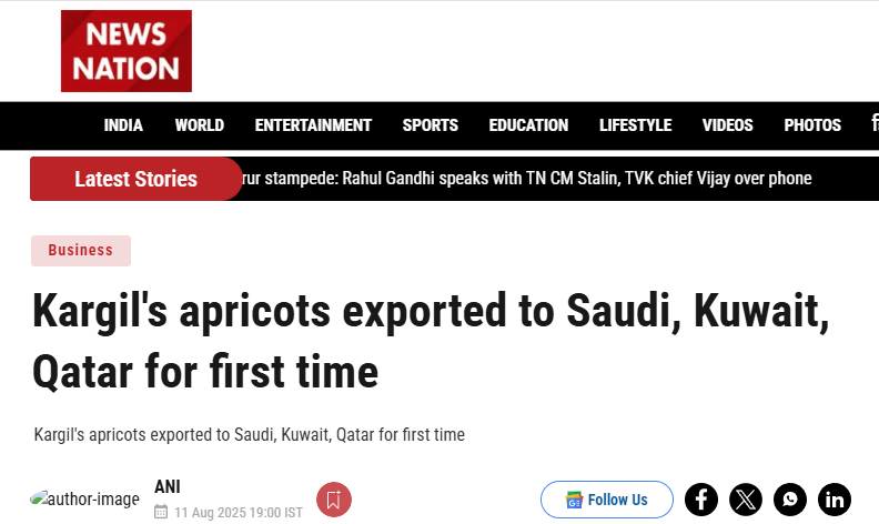 اس کے برعکس، دونوں ممالک کے درمیان زرعی مصنوعات کی تجارت مسلسل بڑھ رہی ہے۔ اگست 2025 میں، کرگل کی خوبانیاں (Apricots) پہلی بار ون ڈسٹرکٹ ون پروڈکٹ اسکیم کے تحت سعودی عرب، کویت اور قطر کو برآمد کی گئیں۔ یہ اس بات کی علامت ہے کہ اناج اور غذائی تجارت رکنے کے بجائے مزید مضبوط ہو رہی ہے۔